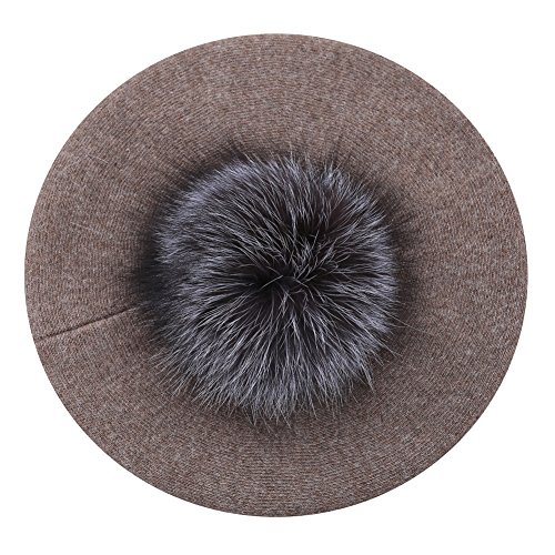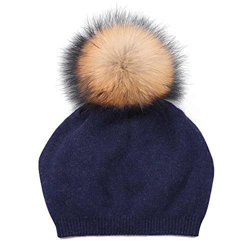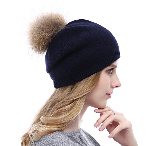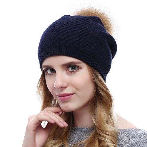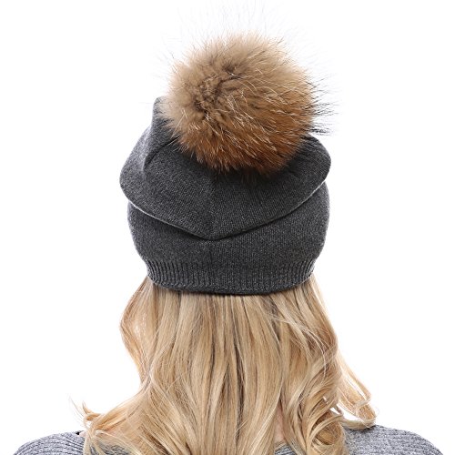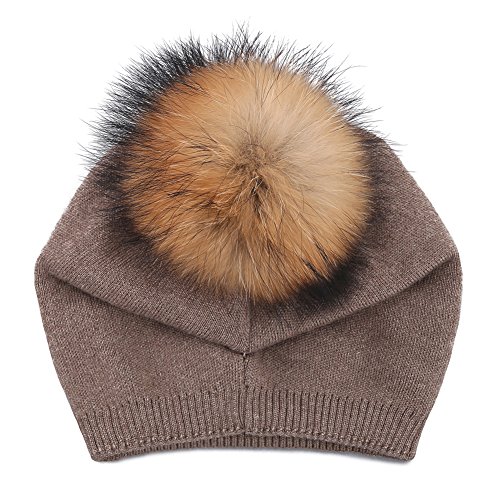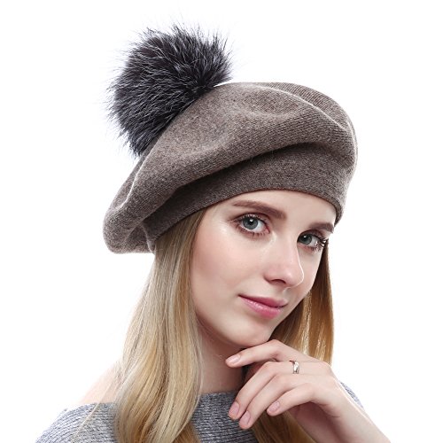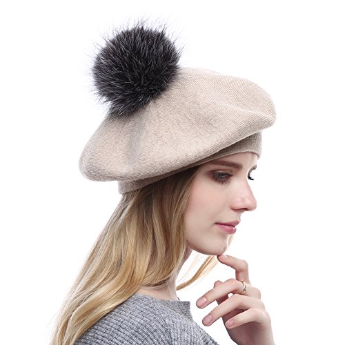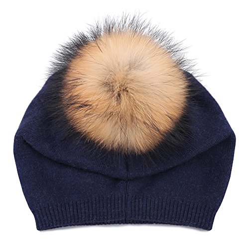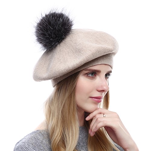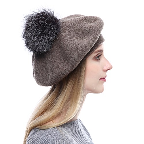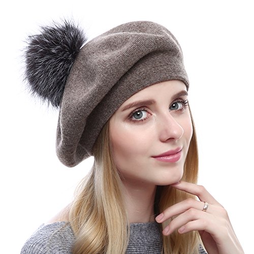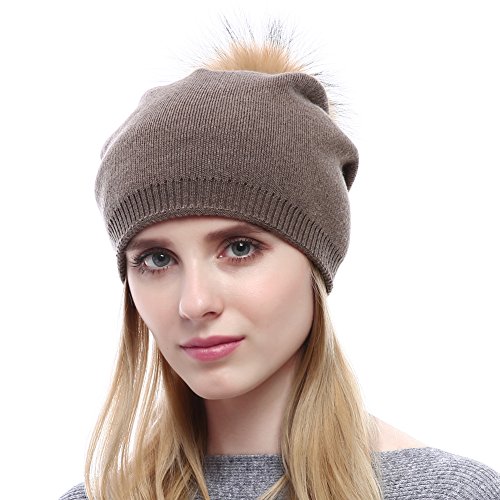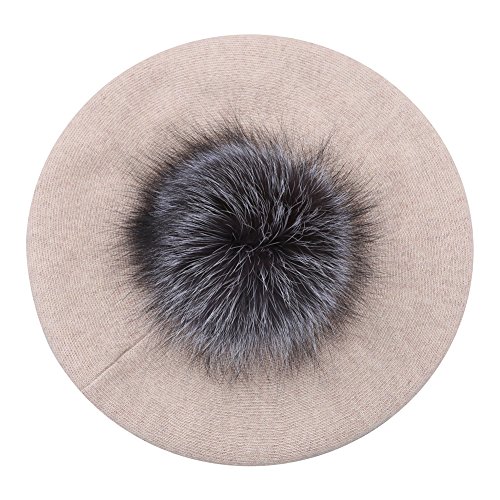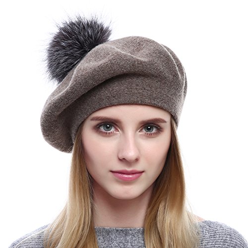 | Winter Berets for Womens Wool Beanies Knitted Cashmere Hats with Fox Fur PomPom |