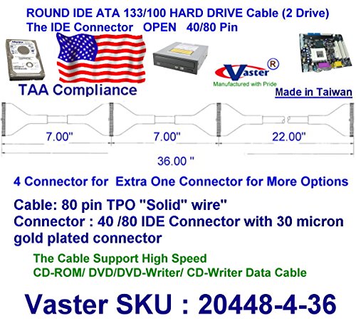 Vaster, UDMA 40/80 Round IDE/EIDE/ATA HDD Data Cable, 3 Drive 36 Inches