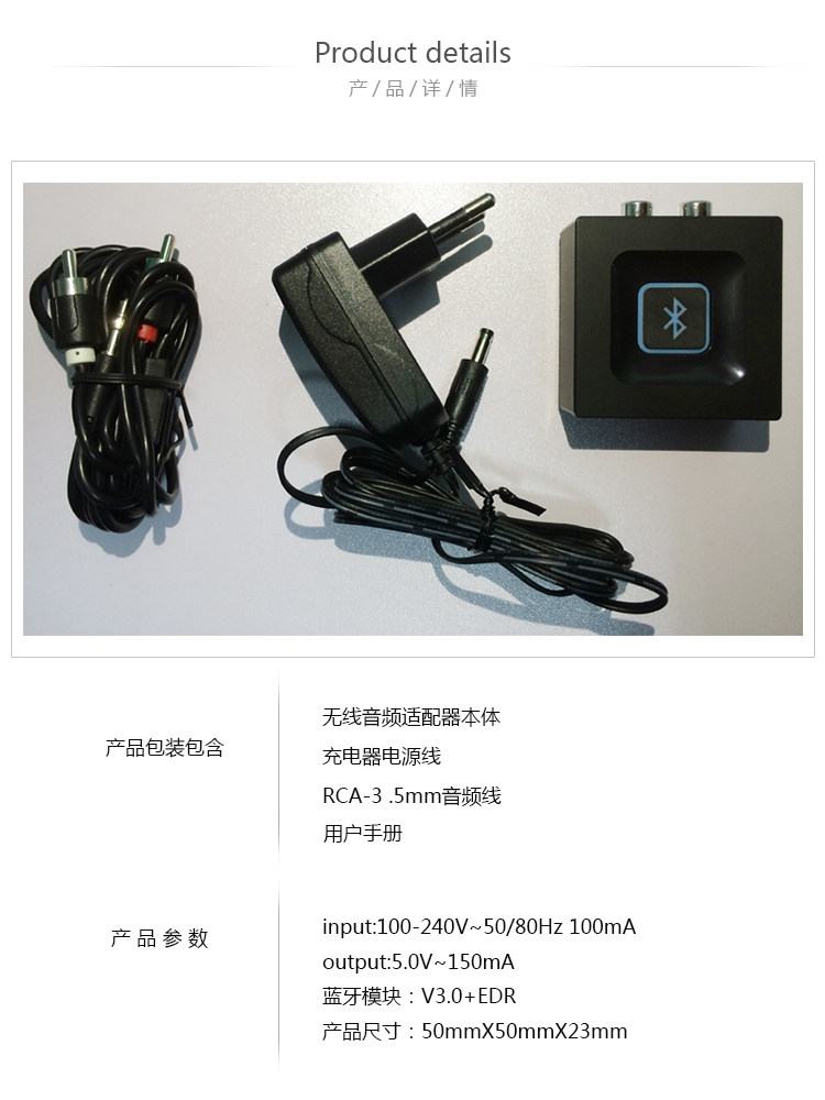 该适配器采用蓝牙V3.0 + EDR通讯模块,音频传输距离为15m,比旧款提升了33%,尺寸比旧款小了很多,约50×50×23毫米。使用时,将音箱与该适配器通过3.5mm音频 线或RCA线连接,然后将蓝牙设备与该适配器进行配对,蓝牙设备的音频即可在音箱中播放出来,适用于听音乐、看电影、玩游戏等场景。