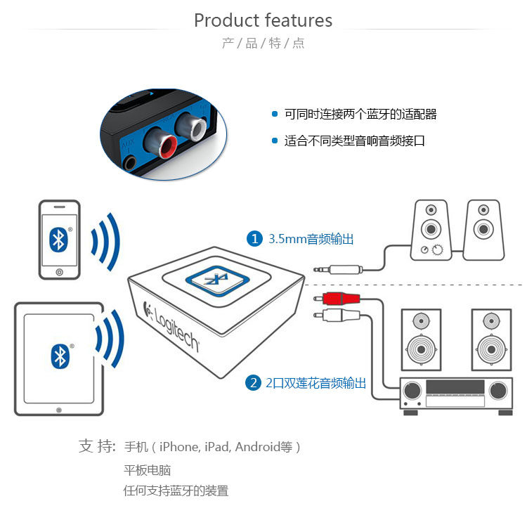 这款Bluetooth Audio Adapter是罗技的第二代蓝牙音频接收适配器。用于将手机或者平板电脑的蓝牙音频转换为3.5mm输出的音频或者RCA输出的音频,连接上蓝牙后就能方便的播放手机、或者平板电脑中的音乐(支持无损品质音乐),再也不用受线缆的束缚了。