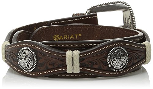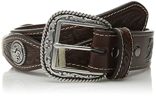 Studio : Ariat Men's Accessories Publisher : Ariat Men's Accessories Binding : Accessory Product Description Enjoy comfort, style and durability from this men's ariat belt by m and f western products . Brown scalloped strap with beautiful tooling measures 1-1/2 inch wide, and has ornate silver conchos. Stylish western look for dress up or your favorite jeans. Removable silver buckle. 0
