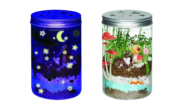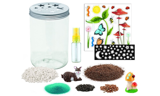 Includes: - 1x mason-style jar - 1x mist sprayer - 2x resin figures (bunny and toadstool) - 15x garden-inspired stickers - 45x glow-in-the-dark stickers