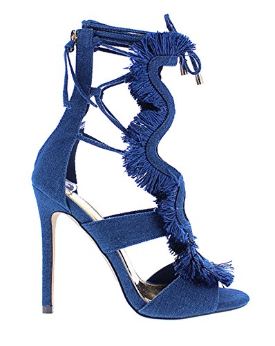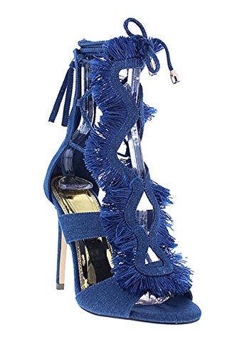 Product DescriptionThis alluring?heel?features , strappy caged design with fringe accent, wrapped stiletto heel, and enclosed back with zip-up closure. Finished with a lightly padded insole and wrapped around lace up closure.0