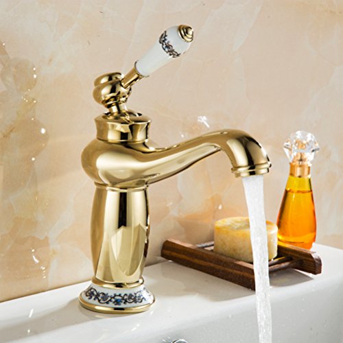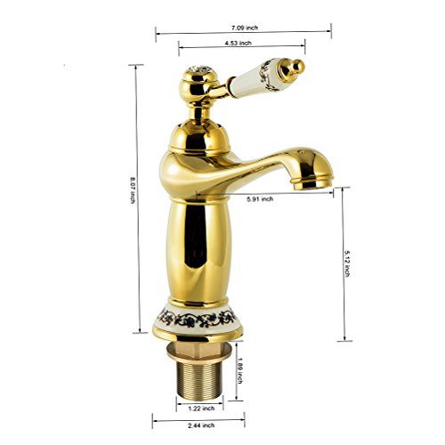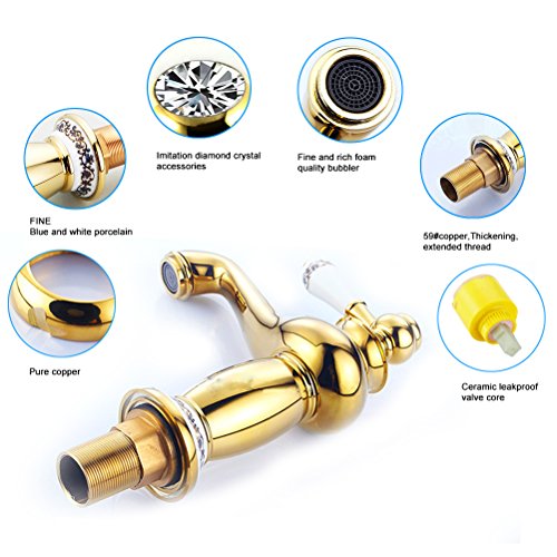 -. Feature : √.NOBLE ENJOYMENT:High-grade gold-plated mirror with a combination of classical blue and white ceramic ,Lasting shiny for your home improvement to enhance a new realm. / √.SAFE AND HEALTH--High-quality lead-free thick brass, complies with all State and Federal low-lead regulations. / √.POPULAR DESIGN--Single handle control hot and cold water.Both winter and summer, can be comfortable with water / √. RELIABLE QUALITY--Ceramic Cartridge Exceed industry Longevity Standards, Ensuring Reliable Drip-Free Use and Durable Performance for Life (tested w/ 1000,000 cycles). / √.WORRY-FREE INSTALLATION--Our bathroom faucet come with hot and cold flexible hoses . All hardware needed for mounting is included with faucet, easy to installation.(To see more pictures,please click on the image magnification area on the right,total 9 pictures)