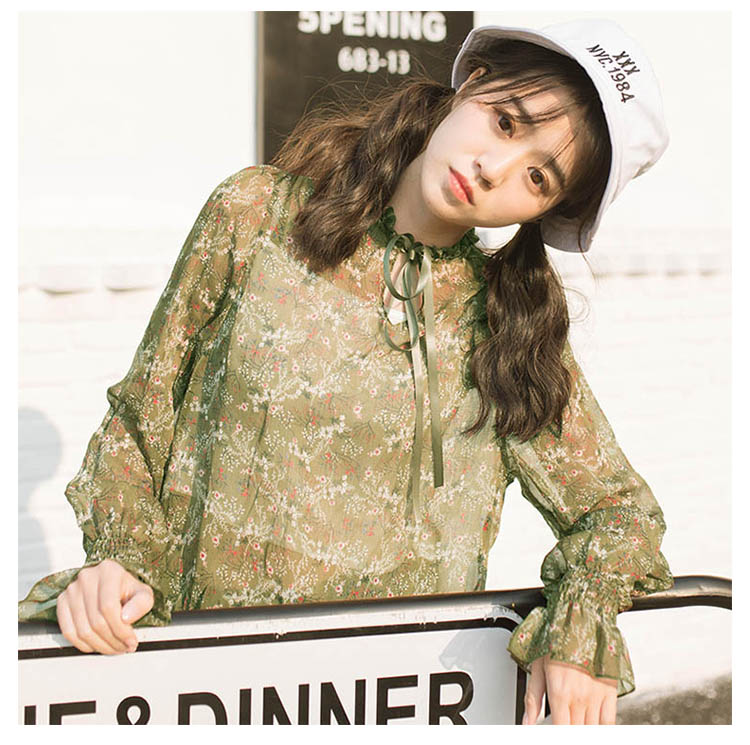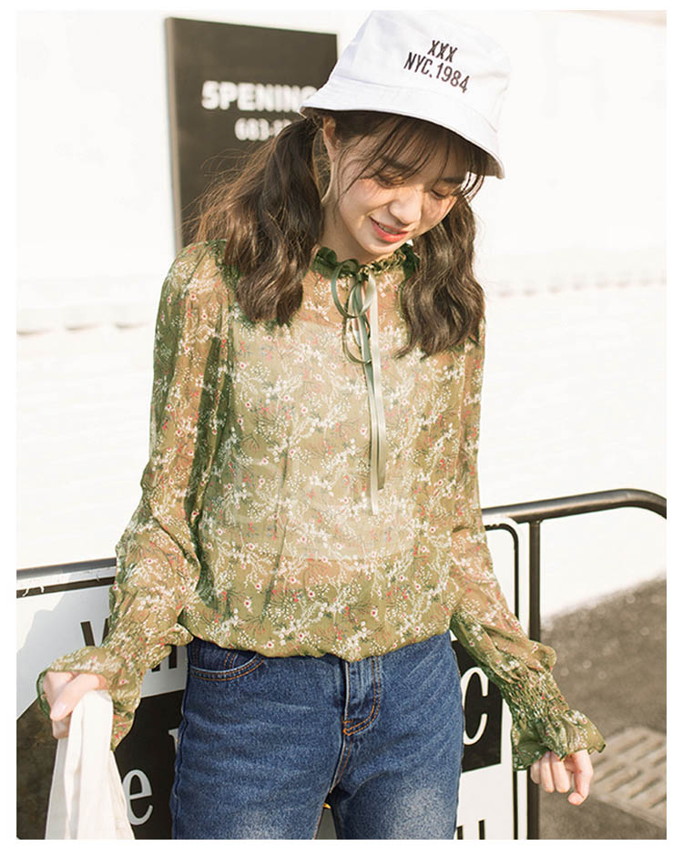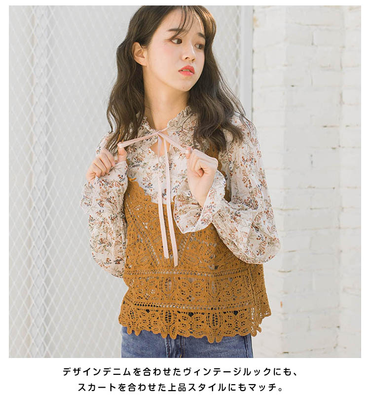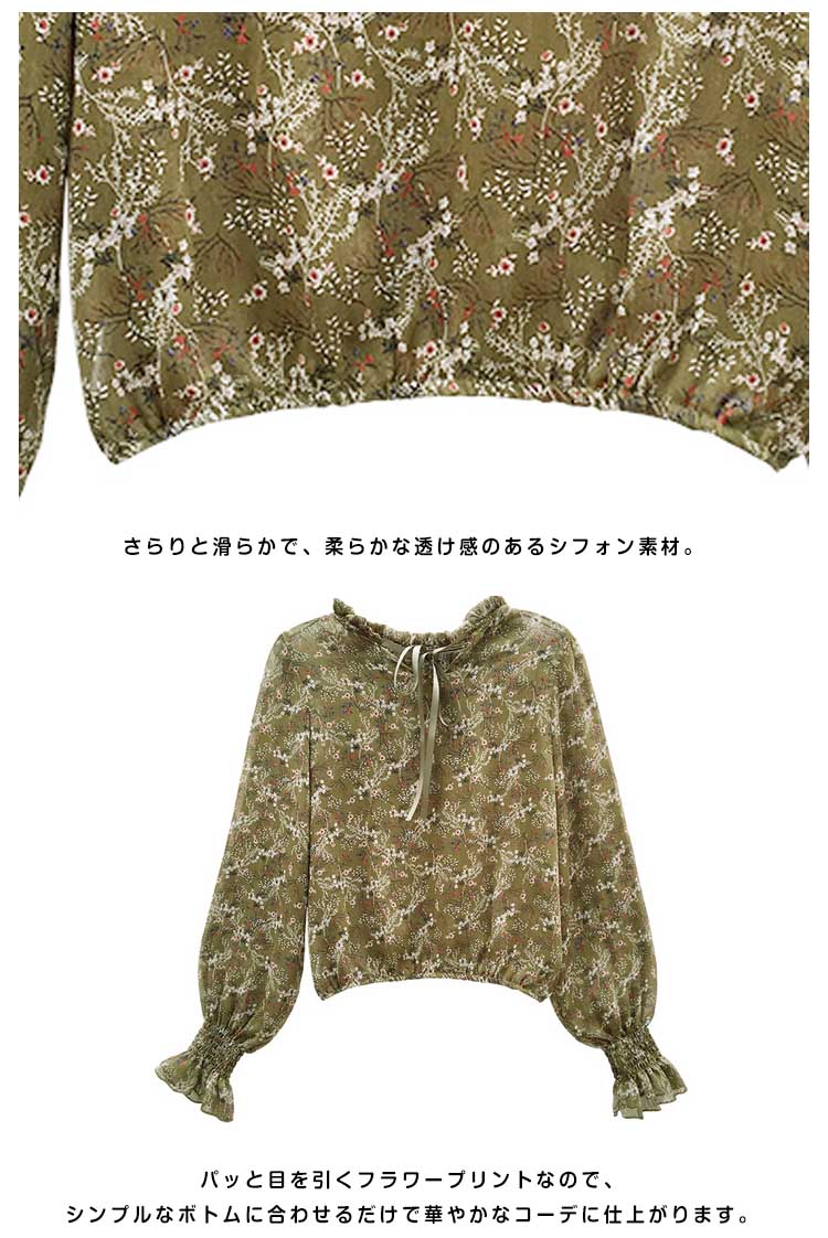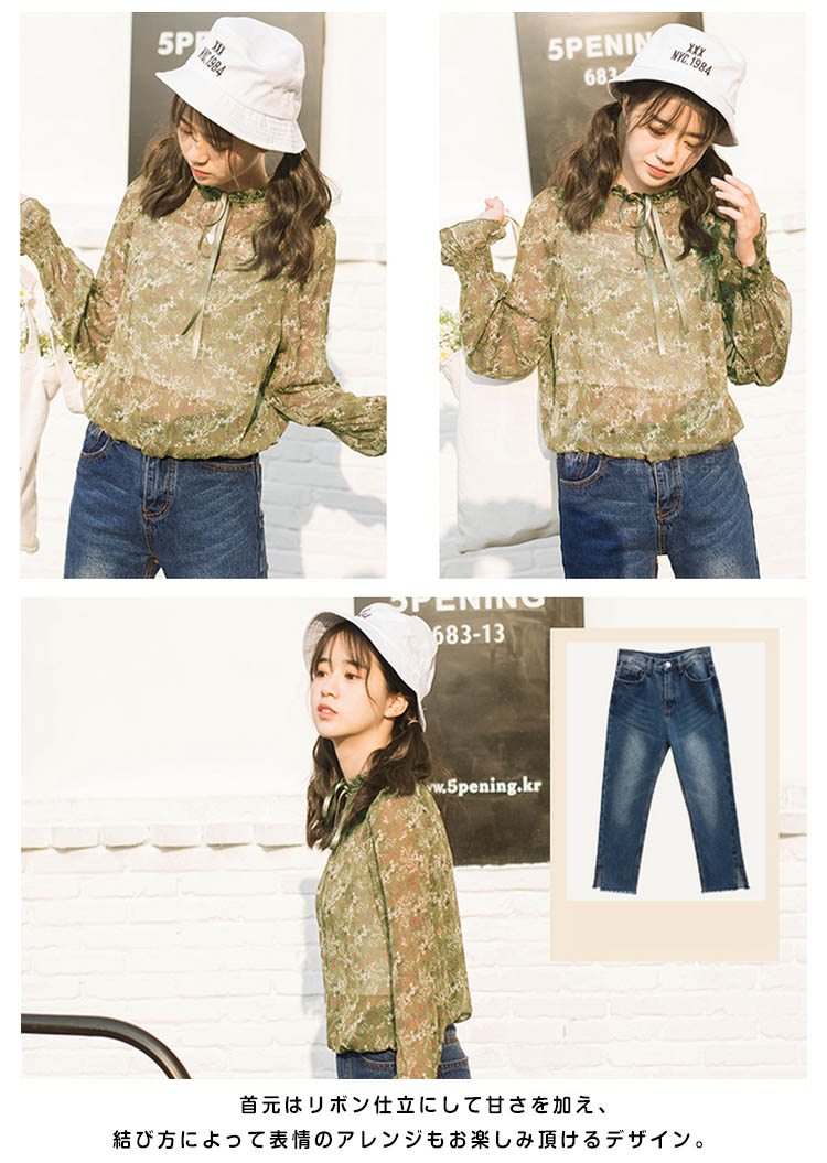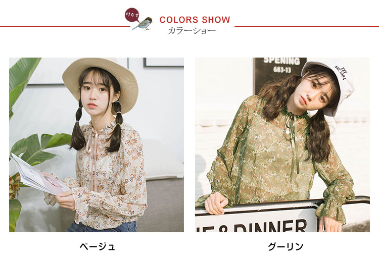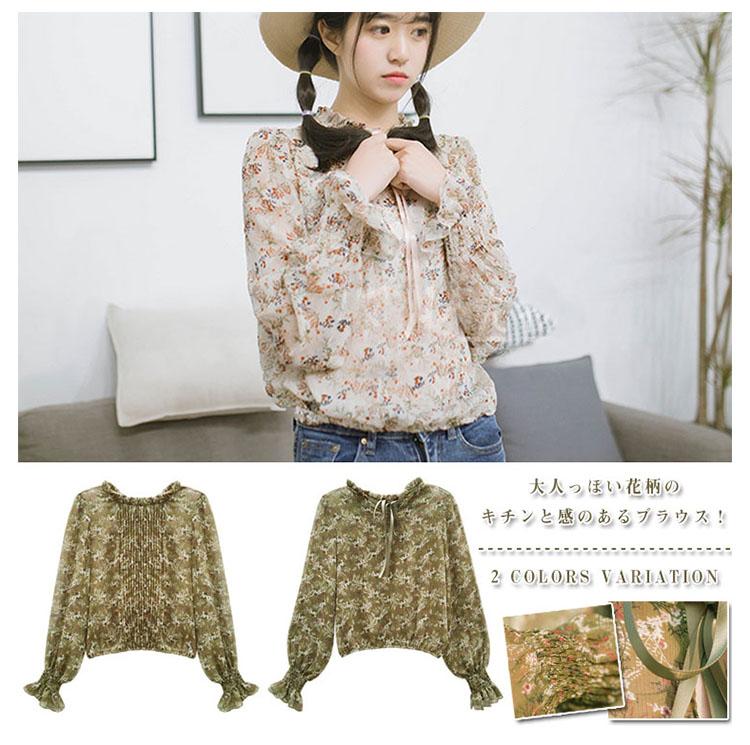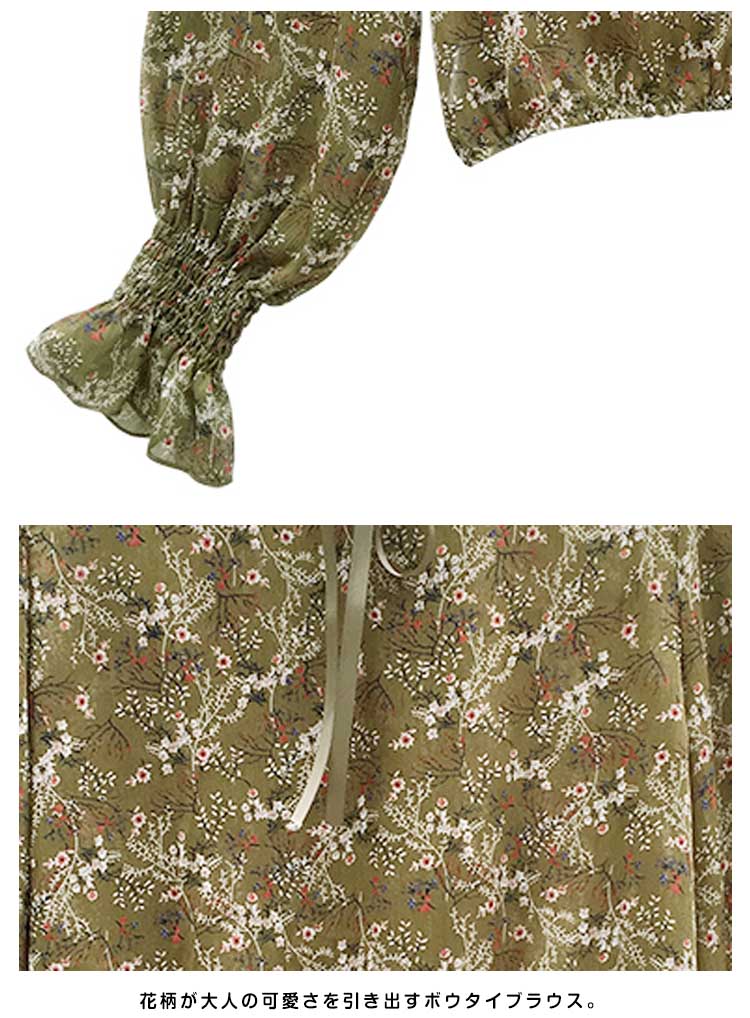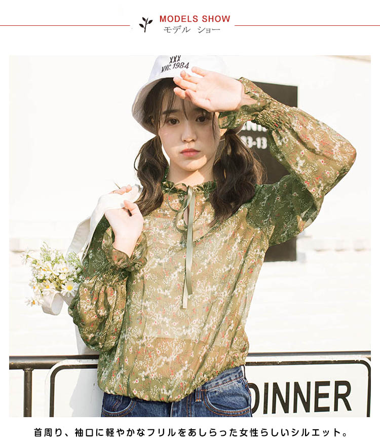 | 大人っぽい花柄のキチンと感のあるブラウス!首周り、袖口に軽やかなフリルをあしらった女性らしいシルエット。首元はリボン仕立にして甘さを加え、結び方によって表情のアレンジもお楽しみ頂けるデザイン。 デザインデニムを合わせたヴィンテージルックにも、スカートを合わせた上品スタイルにもマッチ。 | |