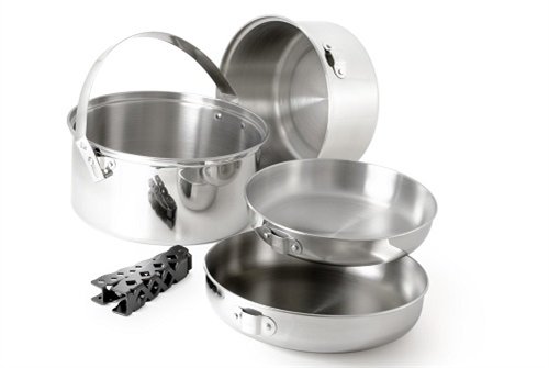 Amazon.com When it comes to durable, lightweight kitchenware, thousands of Boy Scouts can't be wrong. At least that's what GSI Outdoors figured when creating its Glacier line of stainless cookware. Designed to take a beating and keep on cooking, each piece in this Glacier cookset is made of high-grade 18/8 stainless steel, with double-rolled rims for increased stiffness and durability. More importantly, the entire set boasts a lightweight nesting design that packs small, travels easily, and withstands use and abuse. The Glacier cookware set comes in three sizes: small, medium, and large. The small set consists of a 1-quart pot, a 1.5-quart pot, a 6.5-inch frypan/lid, a 7.5-inch frypan/lid, a DiamondBack Gripper, two cutting boards, and a mesh storage bag. The medium cookset comes with the same accessories, but ups the cookware sizes to 1.5- and 2.5-quart pots and 7.5- and 8.875-inch frypans. Finally, the large set offers 2.5- and 4-quart pots, along with 8.875 and 9.75-inch frypans. The pots and frypans let you cook everything from pastas and soups to breakfast flapjacks, with the frypans doubling as lids for the pots. The DiamondBack Gripper, meanwhile, serves as your pot/frypan handle, with hardware that attaches securely to the pots' and pans' exterior brackets. 0