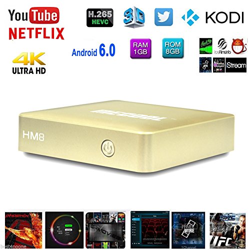 -. Feature : HM8 OTT TV Box is powered by a Amlogic S905X Quad-core A53 and Penta-core GPU, the speed can reach up to 2GHz. It is advanced in image processing and computing. 1GB DDRIII + 8GB EMMC Flash, you can store your favorite multimedia files. / HM8 OTT Box is the newest version with Android 6.0 OS,KODI/XBMC 17.0 TV Box model in 2016. Android 6.0 is to improve user experience compared with other versions of TV Boxes. People can install or uninstall software, games and application programs easily. / Cut your monthly TV subscription and enjoy free movies, shows and live entertainment from all over the world. HM8 OTT TV Box turns any TV into a smart TV. Besides, it supports Miracast, Airplay, Skype chatting, Picasa, Youtube, Flicker, Facebook, Online movies, etc. / Built for entertainment, home theater, business meeting, office work, etc. You can share your movies, TV shows, music with friends all at your fingertips. The Android media player is compatible with 4K media files, bringing you full 4K resolution videos with ultra high quality crisp image and video quality. / H.265 and VP9 decoding, which are the absolute mainstream decoding formats in google. H.265 hardware decoding can save 50% bandwidth resources, let you watch the 4K movie smoothly. 4K 1080i/P resolution is 4 times of full HD, you won't miss every lucid detail of the screen.