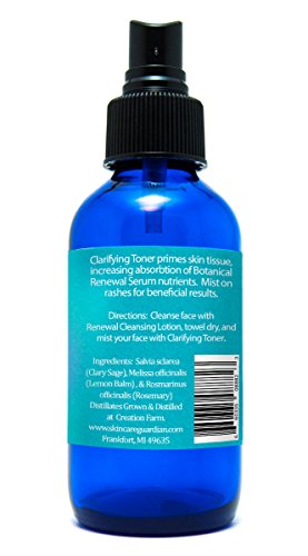 Clarifying Toner is a combination of fresh Rosemary, Lemon Balm and Clary Sage, Designed For Skin Hydration, To Maintain A Healthy Complexion, To Smooth Out Make-Up. Spray On Skin And Cotton Balls To Cleanse Deeply And Clear Clogged Pores. The Toner Tightens The Complexion Reducing Large Pores, Restores Hydration, Smooths Out Fine Lines And Wrinkles, Is Soothing On Rashes Eliminating Hives, Prevents Acne And Removes Blemishes.