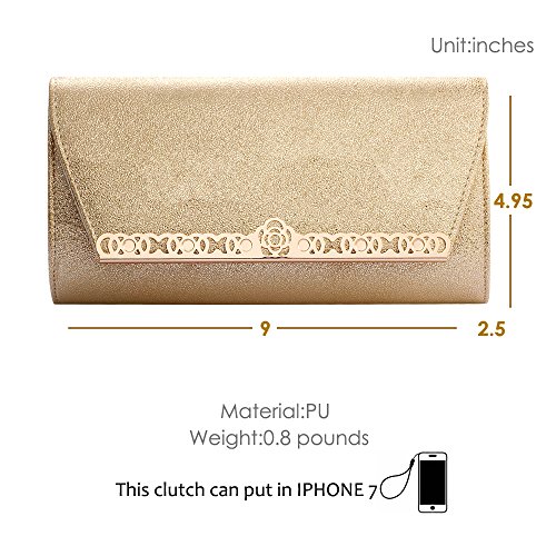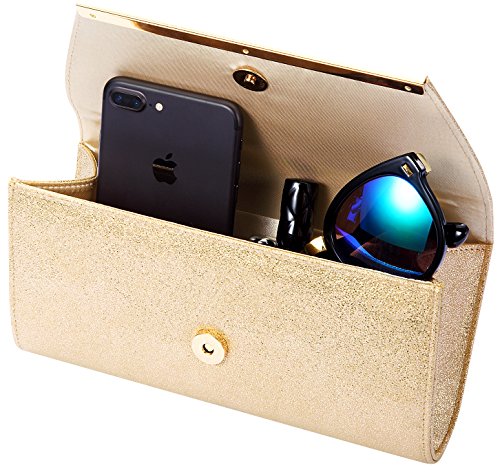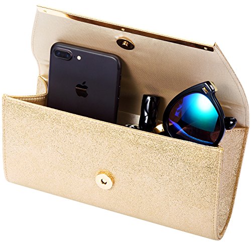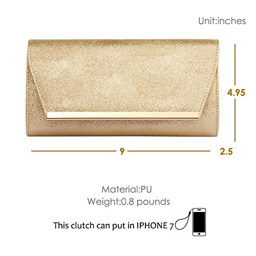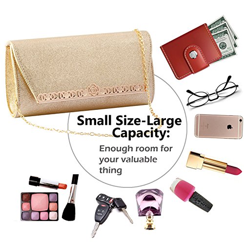 -. Feature : Made of Glitter PU leather. / Size:9"(L)x 4.95(H)" x 2.5 "(W)inches / It is a 3 style in 1 bag (shoulder, clutch, purse) handbag with the chains in some events. / Perfect for all ages in special events weekend, wedding, evening party, prom, cocktail various parties,night out or formal occasions and so on. / The luxurious and spacious satin lined interior provides plenty of room for your valuable thing,such as cell phone,small wallet,mirror,lipstick,makeups,cash,credit card,car keys.