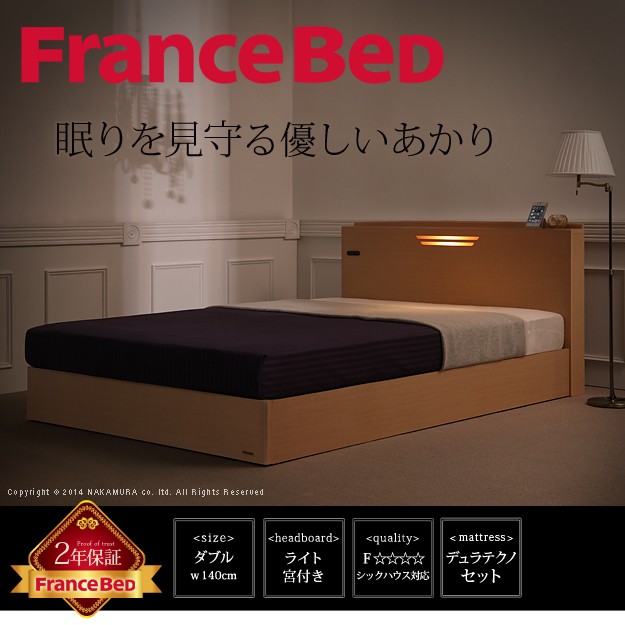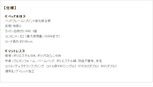 材質:[ベッド]本体-プリント紙化粧合板、コンセント-1口(1500W)、照明-10W(1個)、[マットレス]側地-ポリエステル50%・ポリプロピレン50%、中身-ウレタンフォーム・パームパッド・ポリエステル綿・防虫不織布・羊毛、コイル-デュラテクノスプリング・コイル数660、通気孔-アイレット加工