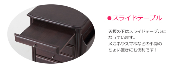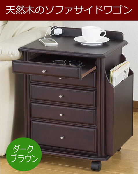 本商品はお取り寄せ商品のため、稀にご注文入れ違い等により欠品・遅延となる場合がございます。誠に恐れ入りますが、何卒ご了承ください。 また、以下の場合には追加送料がかかる場合がございます。  ・同梱区分が異なる商品の複数購入時  【出荷目安】:1 - 4営業日 ※土日・祝除く 【同梱区分】:TS 2232 【梱包サイズ】:通常商品 【代引き決済】:不可  配送伝票の依頼主は出荷元(メーカーもしくは仕入元)名となる場合がございますので、お受け取りの際はご注意ください。   ソファサイドの小物をまとめてしっかりと収納する天然木製のサイドテーブル。キャスター付で移動もラクラク!!お掃除の際も邪魔になりません。引出し4杯とスライド棚付で大変便利。1口コンセント付!雑誌や新聞をしっかり収納するマガジンラック付。左右どちらでも取り付けられます。  【商品名】ソファサイドワゴン  【カラー】 ダークブラウン  【サイズ】(W)42.5×(D)35×(H)55.5cm  【重量】6kg  【材質】天然木桐材(ラッカー塗装)  【付属品】説明書  【生産国】中国  ■キャスターのみお客様取り付けです。  【ご注意事項】 ・本商品は、北海道・沖縄・離島への配送はいたしかねます。あらかじめご了承ください。