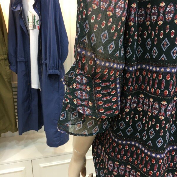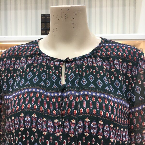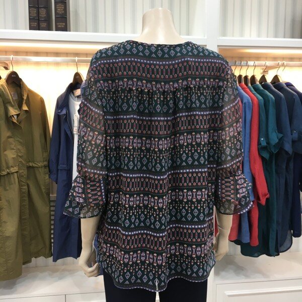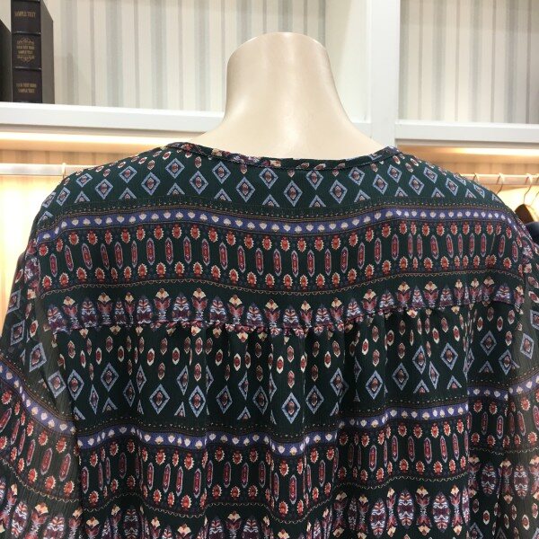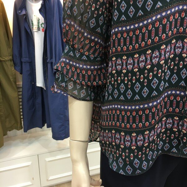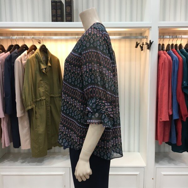 많은 포인트들이 가미된 여성스러운 분위기의 블라우스입니다. 라운드넥 라인에 단추장식을 더했으며 양쪽 어깨를 시작으로 밑단까지 일자로 툭 ! 소매는 이중 셔링 포인트가 들어가 고급스러운 분위기를 연출하였습니다. 소매만 살짝 살이 비치는 시스루재질로 살랑살랑 여성스러움을 강조하였고 에스닉한 프린팅을 더해 낭만이 가득한 분위기 연출을 도와드립니다. 소재는 가벼운 쉬폰 소재로 활동성과 착용감이 좋아요. 총장길이는 66사이즈 기준으로 65cm 입니다.