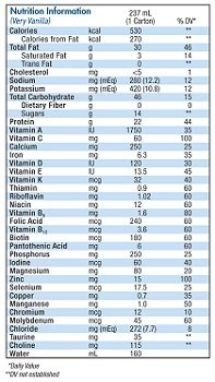 Very high calorie complete nutritional drink that provides 530 calories per 8 fl oz serving, 22 grams of protein, and 26 vitamins and minerals. Appropriate for fluid-restricted diets, and increased calorie and protein needs. Available in Very Vanilla Flavor.