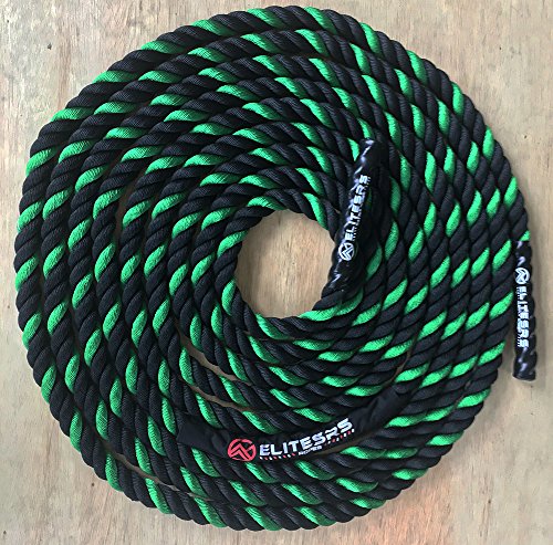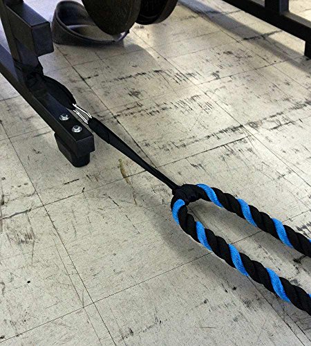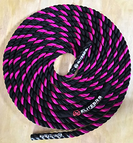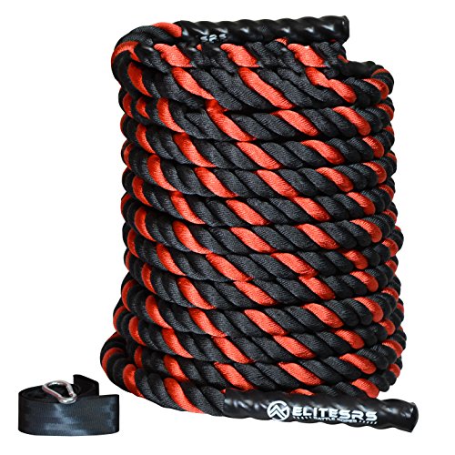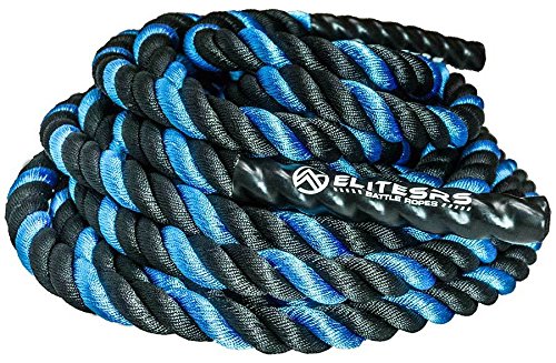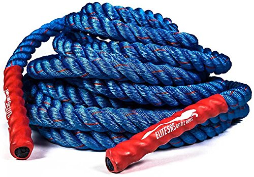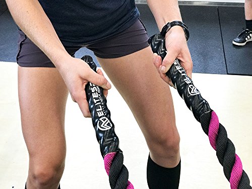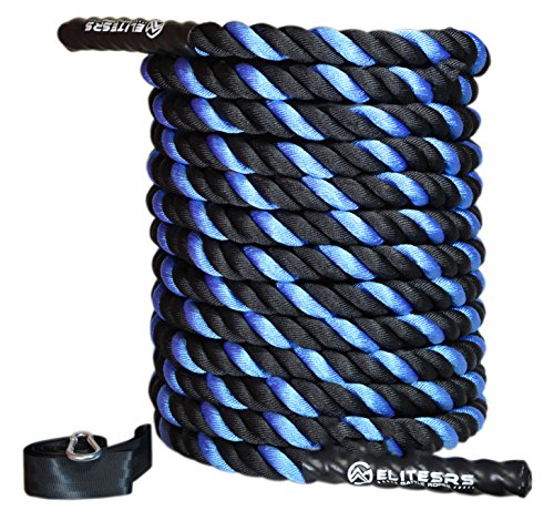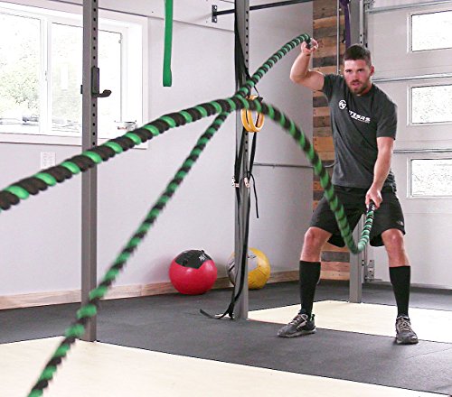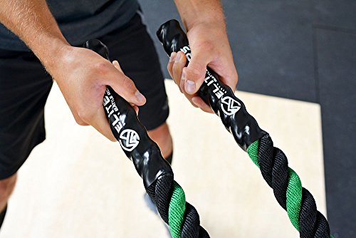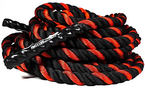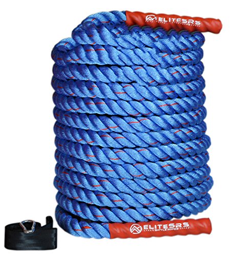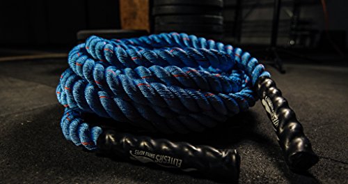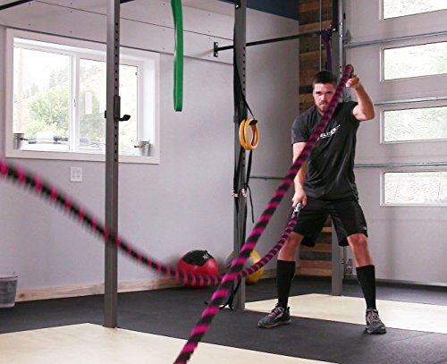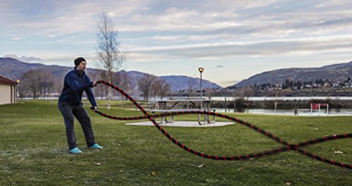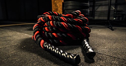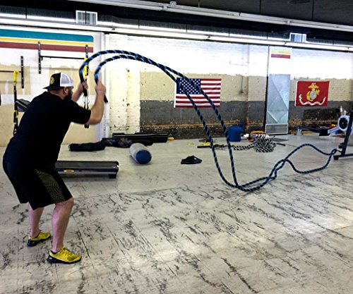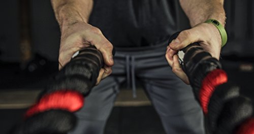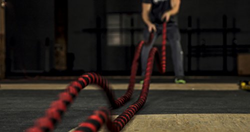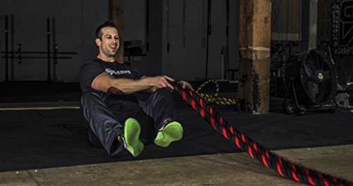 Are you trying to get a heart pumping, high intensity, fast workout, or are you looking to add some muscle and bulk with a grueling strength workout? Battle ropes are a fun, unconventional training system that can deliver great workouts and incredible results for athletes, fitness beginners and everyone in between. The non-stop motion of the ropes engages arms and core and leg, creating rapid increases in endurance and strength. Battle ropes are now a mainstay training tool for athletes who train for power and explosiveness. Our battle ropes are made of a densely woven PolyPropylene and Dacron material, which gives them solid weight and fantastic durability. These ropes will hold up to rough workouts and abrasive surfaces, and can be used outdoors and get wet. And, unlike manilla ropes, these won't rot, retain water or leave behind fibers. Which rope should I get? Thick ropes carry more weight, and longer ropes allow for a more fluid motion. All things being equal, and if you're unsure of which one to get, we recommend the 50 foot length and 1.5 diameter. The longer length will be the most versatile, and the 1.5" grip will be the easiest to hold and use. Our battle rope handles are made of an ultra-durable soft polymer that is heat-shrunk onto the rope and are guaranteed to never come off. Every purchase comes with a free 2" X 16" nylon anchor strap with double sewn, strong (1500 lbs) nylon webbing. This anchor strap allows you to set up your rope anywhere, and is a low friction mount, thereby extending the life of your rope. Colors Available: Black, Blue/Red, Gold/Black, Red/Black Widths Available: 1.5" and 2" Lengths Available: 30ft, 40ft, and 50ft Material: 80% dacron polyester and 20% polypropylene