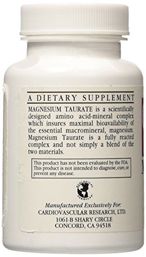 -. Binding : Health and Beauty -. Brand : Cardiovascular Research -. EAN : 0696859034893 -. Feature : Magnesium taurate is a fully reacted complex and not simply a blend of the two materials / Contains no corn, soy, yeast, wheat or other common food or chemical allergens / Dietary supplement -. IsAdultProduct : 0 -. Label : Cardiovascular Research -. Manufacturer : Cardiovascular Research -. MPN : MAGTA -. NumberOfItems : 1 -. PackageQuantity : 1 -. PartNumber : MAGTA -. ProductGroup : Health and Beauty -. ProductTypeName : HEALTH_PERSONAL_CARE -. PublicationDate : 2015-12-14 -. Publisher : Cardiovascular Research -. ReleaseDate : 2015-12-11 -. Size : 125 MG -. Studio : Cardiovascular Research -. Title : Cardiovascular Research Magnesium Taurate Capsules, 60 Count -. UPC : 696859034893