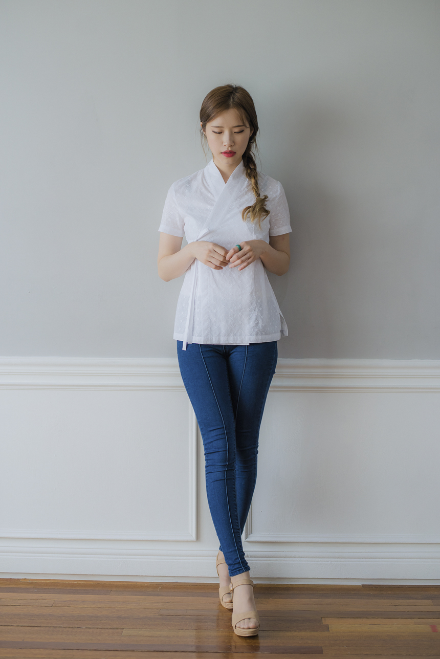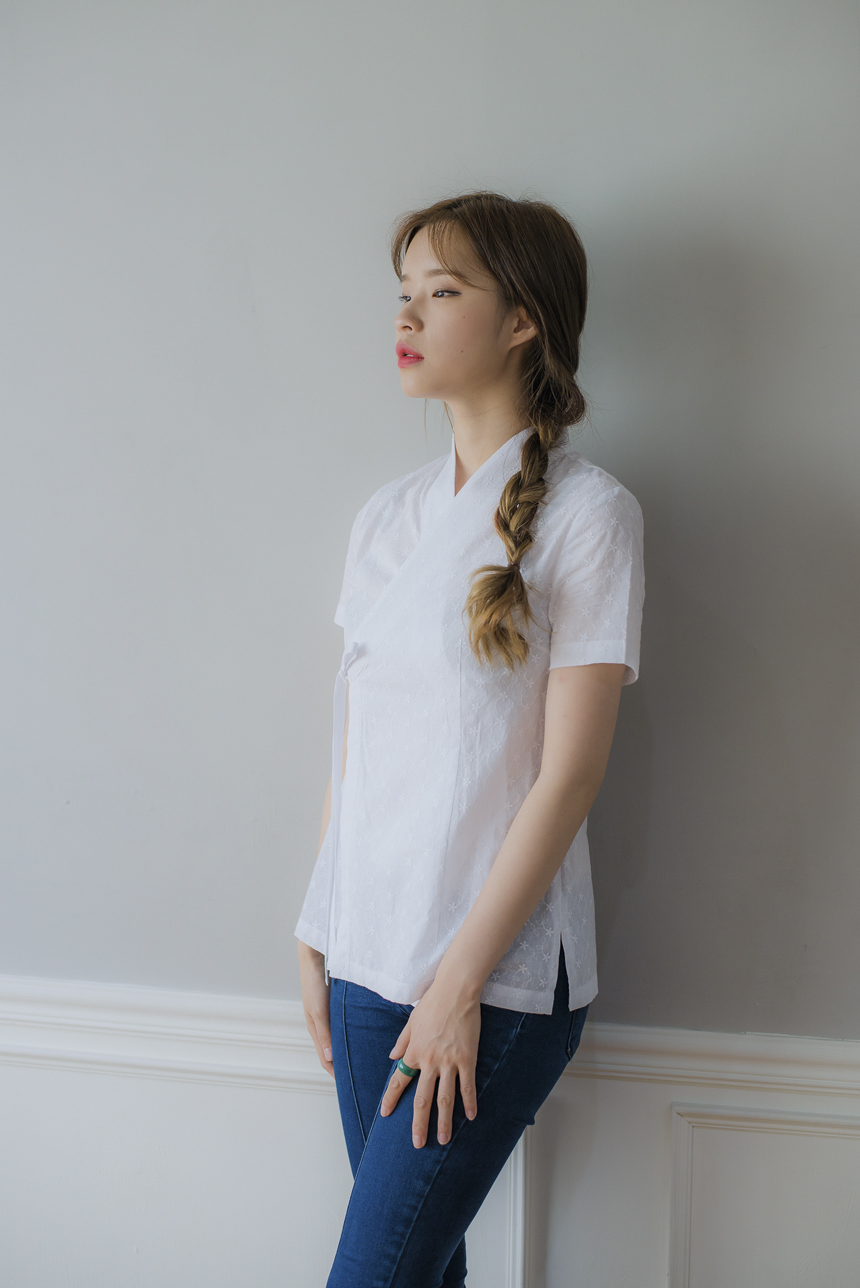 꽃닮의 베스트상품! 시그니쳐 디자인 레이스 저고리블라우스가 시즌에맞는 반소매로 새롭게 디자인되었습니다.
