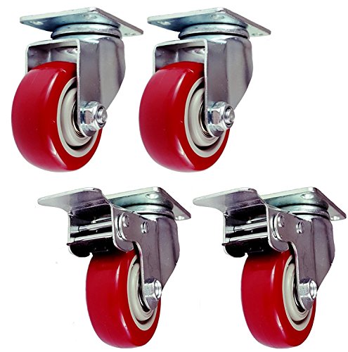 4 Pack 3 Inch Set Caster Wheels Swivel Plate 2 with Brake 2 Plate Heavy Duty on Red Polyurethane Wheels