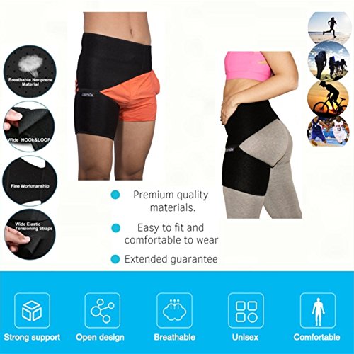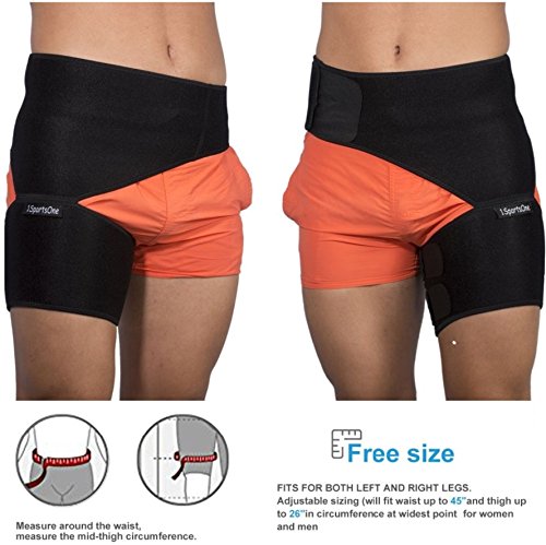 1SportsOne knows what is better for you The Groin Support Brace by 1SportsOne, represents the ultimate sports accessory every person should have. It is specifically designed to help relieve pain resulting from groin pull, thigh injury, sciatica, sacroiliac joint dysfunction, or related conditions. The muscle fever is less painful by wearing this groin support brace. The special design of this brace helps to warm the affected area and increases blood circulation. It helps improve overall stability during movement. By putting pressure on your groin muscle, every activity that your leg takes becomes easier. Try our new copper / flexor hip brace ! Commonly used by people suffering from: - Groin injury, such as groin strain (stretching or tearing of muscle or tendon) and groin sprain (stretching or tearing of ligaments)