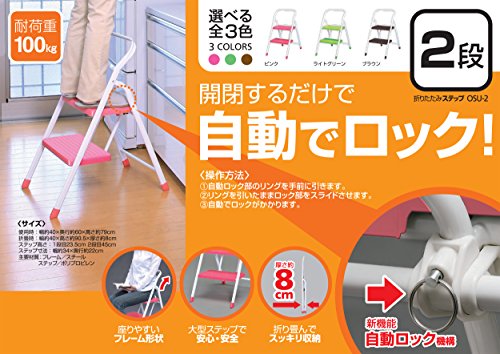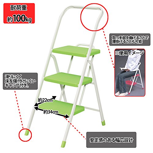 ◆使用しない時は、折りたたんでコンパクトに収納できます。◆安心・簡単な自動ストッパーを採用、踏み台は安定感のある幅広設計です。◆パイプ曲げ加工により腰掛けることが可能です。◆滑りにくく、床を傷付けにくい脚キャップ付です。 / ■ 仕 様 ■カラー:ライトグリーン サイズ(約)使用時:幅40×奥行60×高さ100.5cm折りたたみ時:幅40×奥行8×高さ114.5cm ステップサイズ(約)幅34×奥行22cm、1段目の高さ:23.5cm、2段目の高さ:45cm、3段目の高さ:67cm 重量(約):5.4kg 耐荷重(約):100kg 材質フレーム:スチール、ステップ:ポリプロピレン /Feature