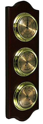 -. Feature : This traditional piece is at home in any fine study, library, upscale restaurant or scientific laboratory. / The rich, solid wood framed dark cherry weather station measures temperature (in °F and °C), humidity (%) and includes a quartz time clock. / The faux brass bezels and mineral glass lens display an air of quality one would expect with a fine, handcrafted weather instrument from Ambient Weather at an affordable P.R.Ice. / This beautifully hand crafted three instrument plaque is wall mountable with a suspension eye on the back of the plaque.