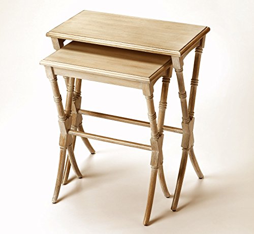 -. Feature : Perfect for home or office, this alluring set of nesting tables features traditional styling and elegance. / These space saving tables can be moved about the room when extra table surface is needed, or nested one under the other. / These tables feature elegant criss-cross legs with a bamboo inspired design. / Crafted of solid rubber wood, MDF and choice cherry veneers in a lightly distressed driftwood finish. No assembly required. / Set of two. Large Table: 22"W x 12"D x 26"H. Small Table: 18"W x 10"D x 24"H
