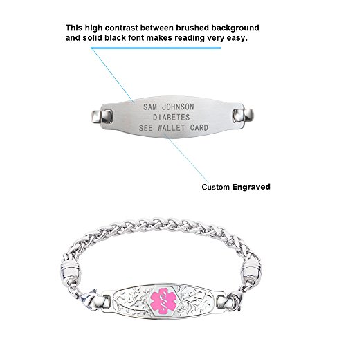 -. Binding : Jewelry -. Brand : Divoti -. Department : womens -. Feature : Easily provide your custom engraved content by selecting the CUSTOMIZE NOW button to the right. / Custom engraved in high contrast black laser engraving to personalize your medical message (on back : 3 lines of 18 characters, spaces included) / Hypoallergenic 316L medical alert bracelet and comes with size options 6.0-8.5 inches. / Deep embossed caduceus symbol with hard enamel filled on the front of medical alert bracelet. Excellent wear resistance. / Includes free customizable medical alert wallet card, medical alert smartphone apps and Velvet gift bag. -. Label : Divoti Inc. -. Manufacturer : Divoti Inc. -. Model : 5616PK -. MPN : 5616PK -. PartNumber : 5616PK -. ProductGroup : Jewelry -. ProductTypeName : FASHIONNECKLACEBRACELETANKLET -. Publisher : Divoti Inc. -. Studio : Divoti Inc. -. Title : Divoti Custom Engraved Beautiful Olive Medical Alert Bracelet -Wheat Stainless-Pink