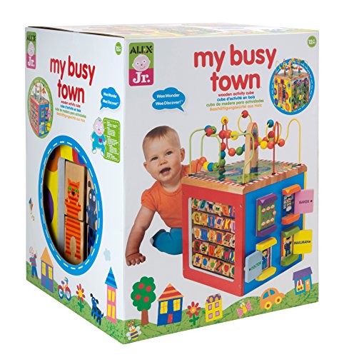 ALEX Jr. My Busy Town Wooden Activity Cube has many activities to keep your toddler engaged that are all part of an amazing journey of learning through play. This toy features a sturdy wooden base that will withstand even the most demanding trips into Busy Town. The multi-dimensional activity cube has five different sides of fun games for your little one; curvy bead mazes, peek-a-boo open and close doors, racing car rollers, animal matching and ABC tiles. With so many different activities, your toddler is sure to stay entertained with this toy for hours. Stable, colorful and fun to look at, the activity center is made of sturdy wood and measures 16in. high by 12in. wide by 12in. deep. Recommended for children 12-months of age and up.