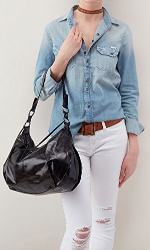 Color/material: black 100% genuine leather. Exterior design details: Back magnetic pocket- perfect fit for your smartphone. Interior design detals: 1 zip pocket with a slip pocket/pen pocket on top; 2 cell pockets. Measures 15.5in wide x 11.5in high x 4in deep. 13in Strap Drop. Zip closure. Imported