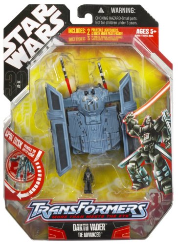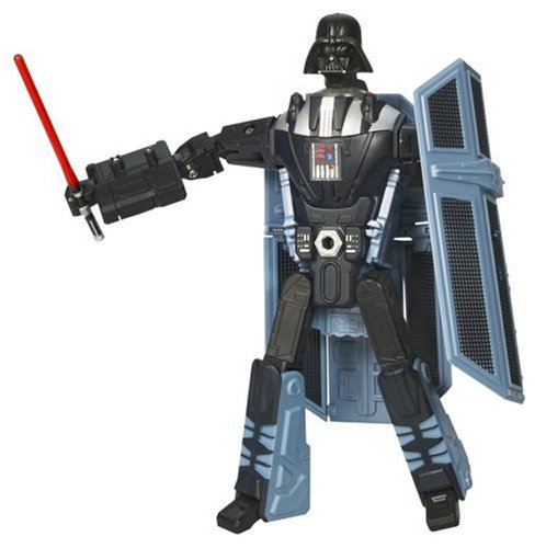 -. Binding : Toy -. Brand : Hasbro -. EAN : 0653569098652 -. Feature : As a sinister lord of the Sith, Darth Vader is on a mission to crush the rebellion and bring young Luke Skywalker before the Emperor / Using the power of the dark side, Vader changes into his Advanced TIE fighter mode and combs the galaxy for Skywalker / Amazing Star Wars figure converts from Advanced TIE Fighter vehicle to Jedi-crushing Sith Lord and back / Figure comes with 2 projectiles and Darth Vader pilot figure / One awesome addition to your collection -. IsAdultProduct : 0 -. Label : Hasbro -. LegalDisclaimer : Ages 5+ -. Manufacturer : Hasbro -. Model : 85895 -. MPN : 85895 -. PackageQuantity : 1 -. PartNumber : 85895 -. ProductGroup : Toy -. ProductTypeName : TOYS_AND_GAMES -. Publisher : Hasbro -. ReleaseDate : 2006-06-12 -. SKU : 228536_VaderTie -. Studio : Hasbro -. Title : Hasbro Star Wars Transformers - Vader and Tie Fighter -. UPC : 653569098652