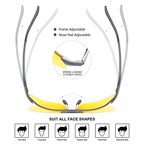 Size: √ Temple Length: 136 mm √ Frame Width: 140 mm √ Lens Height: 52 mm √ Lens Width: 63 mm √ Bridge: 14 mm √ With spring loaded hinge and adjustable nose-pad, this aviator night driving glasses suit for all kinds of face shape.