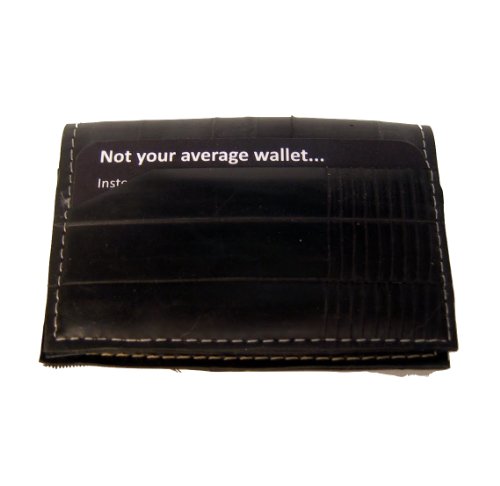 -. Feature : Durable, water-resistant compact wallet / Exterior is made from upcycled bicycle inner tubes / Features a mesh window for quick ID viewing / Fits folded cash, and up to 8 cards per pocket / Measures 3.75 inches by 0.25 inch by 2.75 inches