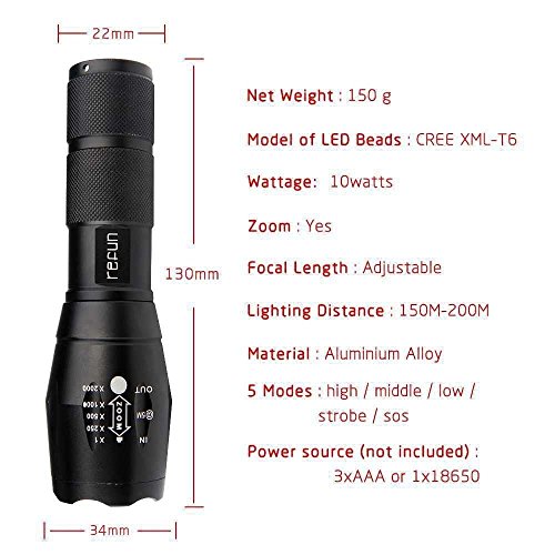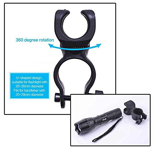 - Feature : Flashlight Life: Approx 100000 h ;Material: High quality 6061-T6 Aluminum / Flashlight Switch: Press Tail-cap on/off ;Skid-proof design & water resistant design, A perfect item for outdoor sports / Flashlight: has adjustable focus range for different usage, stretching to adjust its focus / 5 Modes for flashlight: high / middle / low / strobe / sos; No Tools Needed - Quick Release Mount / 360 degree rotation holder-shaped design, suitable for flashlight with 20-26mm diameter, fits for handlebar with 20-28mm diameter