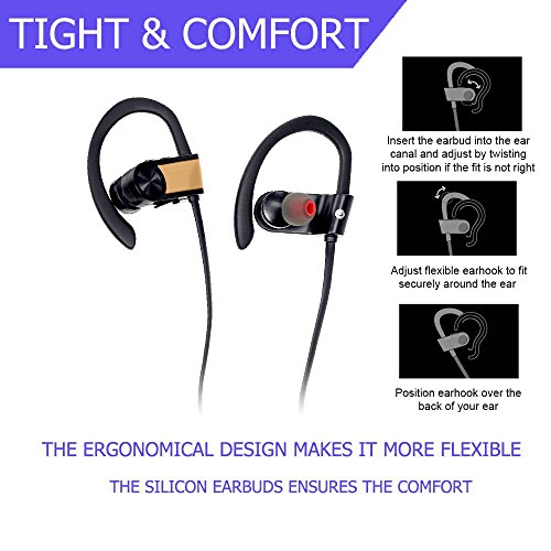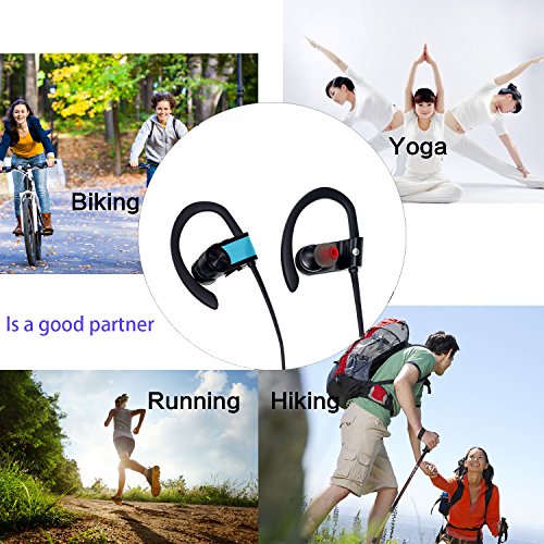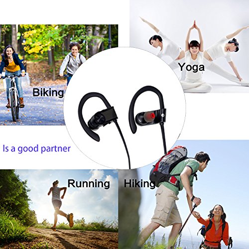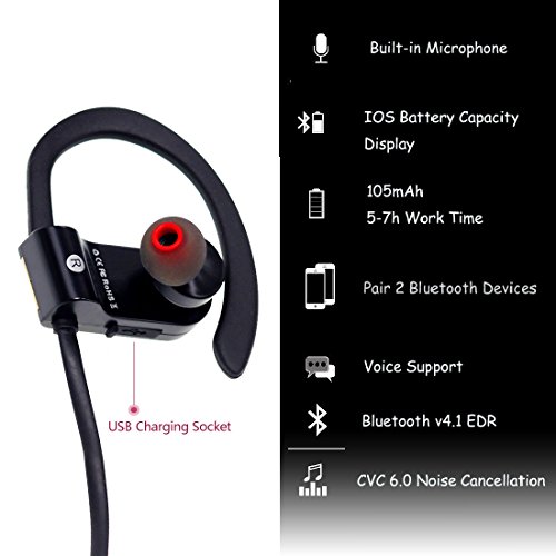 -. Feature : High fidelity sound;this headphone is equipped with CSR chip,ensures maximum signal quality, and guarantees outstanding sound quality. / UItralight and comfortable design,ergonomically-shaped in-ear plugs and ear loops brings comfortable and no heavy feeling even after long-time wearing.Sweat-Resistant design,can avoid your headphones being damaged by sweat,while you are going outside or doing exercise. / Comes with different size ear-buds for choice to fit for different size ears,it will bring comfortable wearing experience for peoper,the fit ear-buds can also block the noise for oueside to prevent the sound quality being disturbed. / Can say "Yes" to answer or say "No" to reject your incoming phone calls, 5 hours music playing for full battery charge,2 hours Super quick charge time with full charge light indication.The headphone battery status will be automatically displayed on the IOS Phone screen. / With easy to USE buttons Allows Skip/Play/Pause on your music tracks as well as all phone use without reaching your phone. Up to 30ft Bluetooth range in the open space and 10ft in the obstacles space. Can be connected with two devices Simultaneously. Super quick pairing with android, IOS and other bluetooth devices.