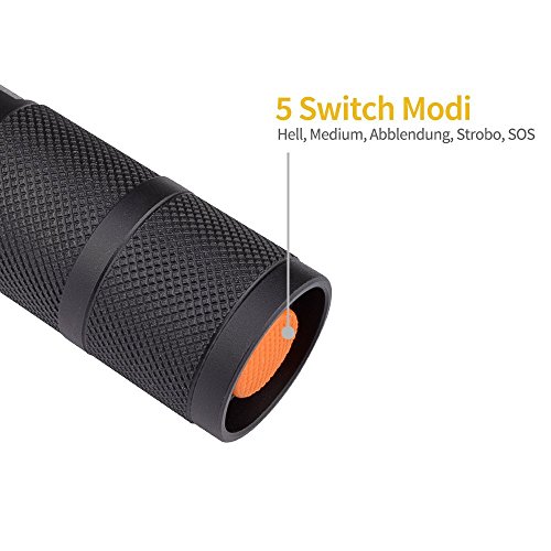 - 【Five modes】 Tap the red button on the tail of flashlight to switch 5 light mode, high / medium / low / strobe / SOS.