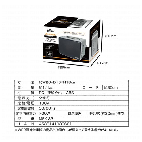 ●치수:약W26×D16×H18cm ●코드:약85cm ●중량:약1.1kg ●재질:PC 아연 도금 ABS ●전원 방식:교류식 ●정격전압:100V ●정격주파수:50/60Hz ●정격소비전력:700W ●대응 두께:4매 잘라(약30mm)까지