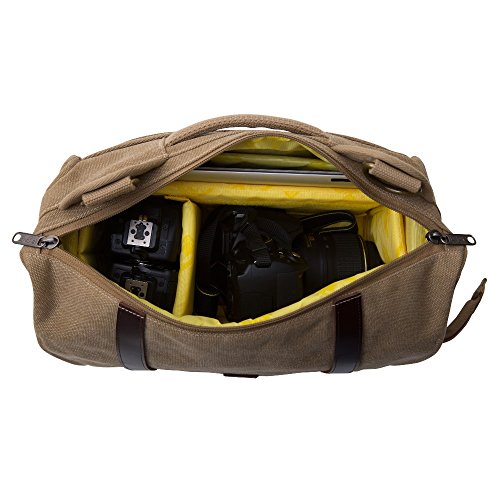A Mix of canvas, Brass and leather give this bag good looks while the smooth well-padded interior protects your gear from the rigors of travel