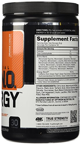 -. Binding : Health and Beauty -. Brand : ON -. ClothingSize : 30 SERVINGS/270 OZ -. Color : Orange -. Department : unisex-adult -. EAN : 3531460595289 -. Feature : Optimum Nutrition -. IsAdultProduct : 0 -. Label : Optimum Nutrition -. LegalDisclaimer : WARNING: KEEP OUT OF REACH OF CHILDREN. Check with a qualified health care professional before taking this product if you are pregnant or nursing a baby, under 18 years of age, have any known or suspected medical conditions, and/or if you are taking any prescription or OTC medications. PHENYLKETONURICS: CONTAINS PHENYLALANINE.CONTAINS SOY (LECITHIN) -. Manufacturer : Optimum Nutrition -. Model : hhh-kyyy-tra-rat8137 -. MPN : 352276 -. PackageQuantity : 1 -. PartNumber : 352276 -. ProductGroup : Health and Beauty -. ProductTypeName : HEALTH_PERSONAL_CARE -. Publisher : Optimum Nutrition -. Size : 0.6 lbs -. Studio : Optimum Nutrition -. Title : Optimum Nutrition - Amino Energy Orange (30 Servings) -. UPC : 748927025255