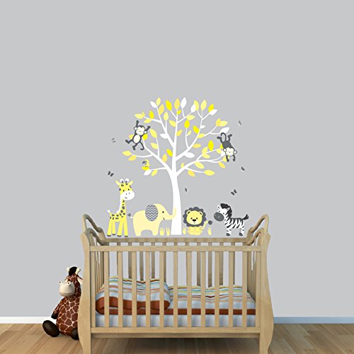 - Decal Includes: 1 tree with leaves (approx. 29" wide x 37" high), 2 Monkey (approx. 6" x 8" and 5.4" x 9.2"), 1 elephant (approx. 14.8" x 9.7"), 1 Giraffe (approx. 8.4" x 18.3"), 1 Lion (approx. 9.2" x 8.6"), 1 Zebra (approx. 10.5" x 10.7"), 1 Bird (approx. 2 " x 2.4"), 6 Butterflies, 4 Grass, and 2 Optional Bows.