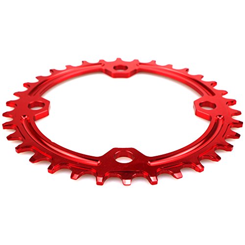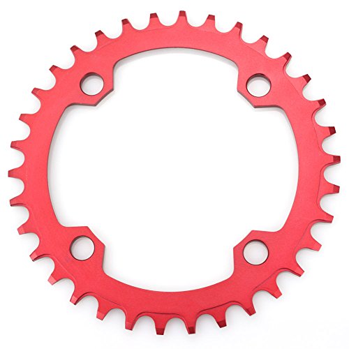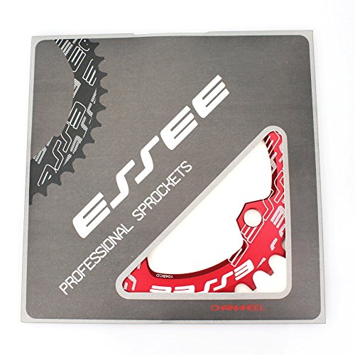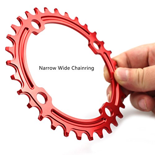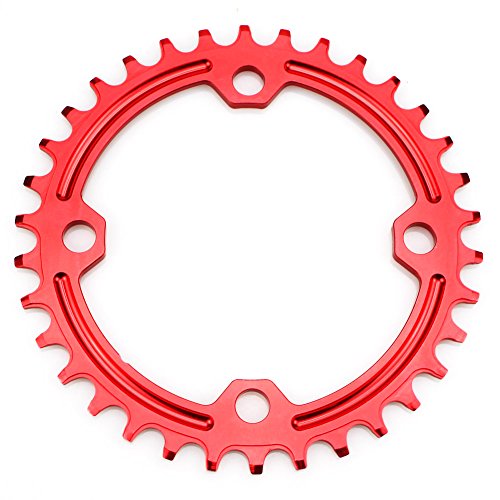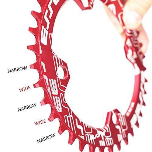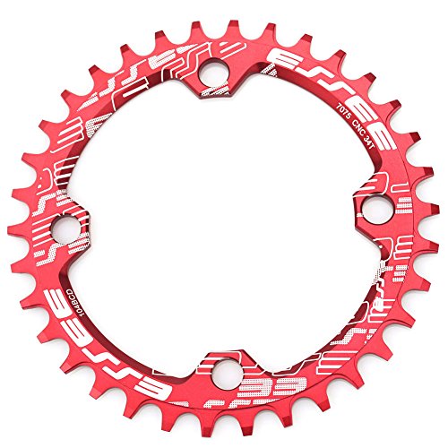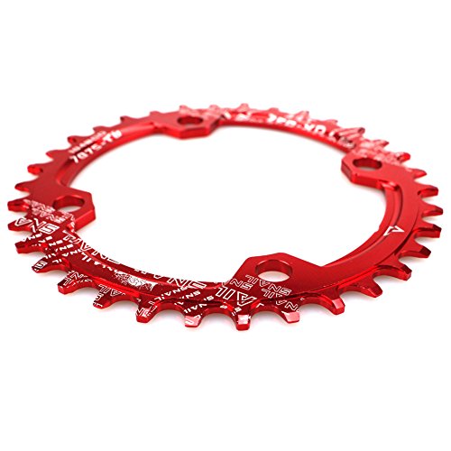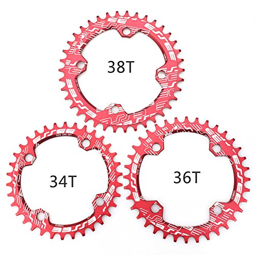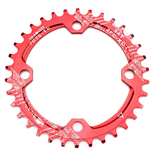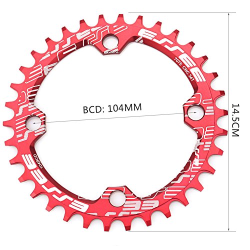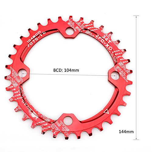 SPECIFICATIONS: Material: Machined 7075 T6 aluminum Finish: CNC PRECISION PROCESS Color: Red Range: 34T Compatibility: 9/10/11 speed Size/BCD: 104BCD Light Weight: 52g Feature: 1.The new narrow-wide teeth design increases chain retention, wear life, and reduces friction and noise. 2.Larger wide tooth design provides maximum ring durability and drop performance 3.Super durable and light weight 4.Excellent Fit and Great Value 5.Easy to install and fits perfectly the 104mm bolt pattern Installation Notes: 1.This chainring's BCD(bolt circle diameter) is 104mm. Before submiting the purchasement, please make sure that your crankset's BCD is 104mm,otherwise they won't fit. 2.Pay attention to the chain length, generally with the chain through the former single disc and the flywheel, under the condition of without the dial,section 4 section chain more for standard.