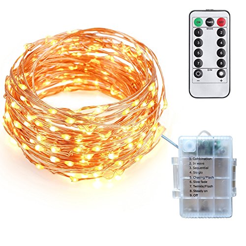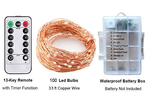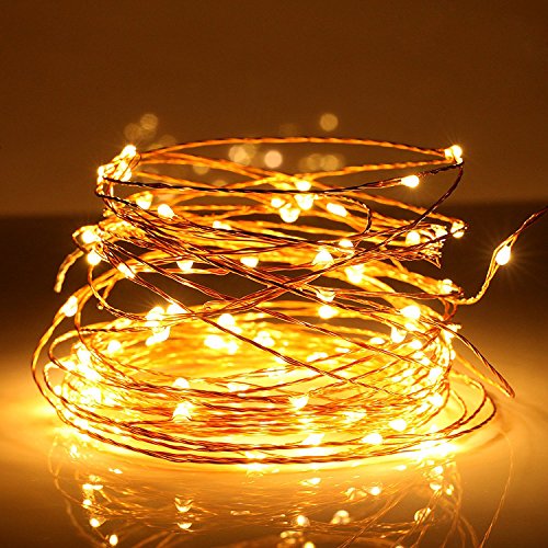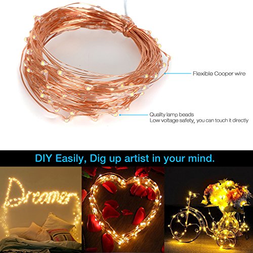 - Overview: The LED lights string is 33ft (10M), contains 100LEDs. Cost effective and energy efficient. Warm white battery operated rope lights create a magical and eye catching lighting experience, which is perfect for novelty DIY lighting, make your life colorful. A cozy LED string light is perfect for adjust your decoration. High quality copper wire and bulbs make the lights be durable for daily use. Life can be up to 50000hours.