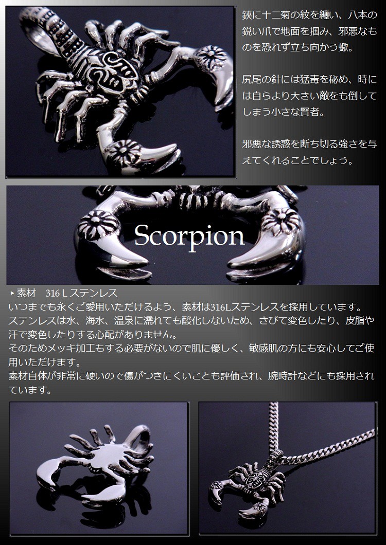 ※販売価格はペンダントトップ1個+ネックレスチェーン1本の価格です。スコーピオン(サソリ)+5mmボールチェーン付きサソリは悪いことを断ち切るという意味合いがあります。ただ単にサソリを写実的に表現するだけではなく、尾や胴部分の模様、鋏(ハサミ)には十二菊の紋が描かれていたり、デザイン性を追及した一品です。リアルさの中に遊び心を秘めており、圧倒的な迫力で存在感抜群です。■サイズ縦45mm×幅32mm×厚み11mmチェーンを通す部分 直径8mm■素材:サージカルステンレス肌に優しく、敏感肌の方にもお勧めの素材です。皮脂や汗、水、海水、温泉などで濡れてもほとんど変色せず、傷にも強いことから、腕時計の素材としてもよく使われています。