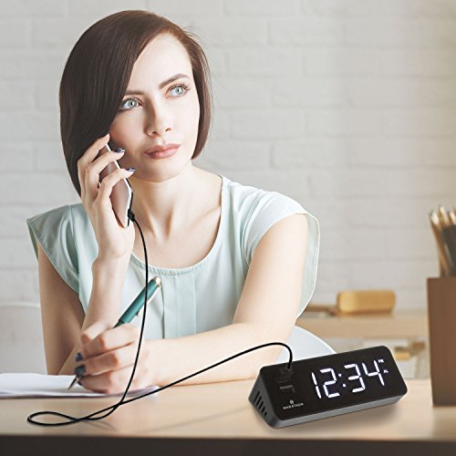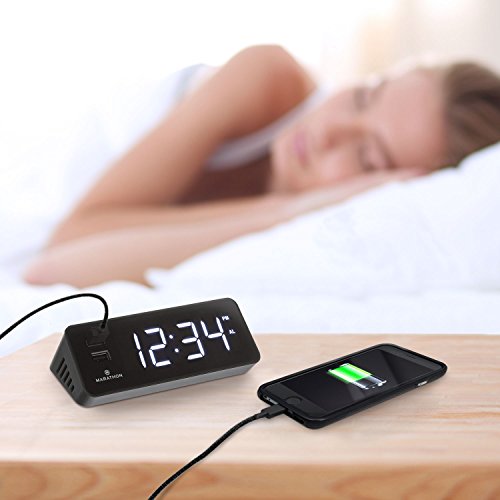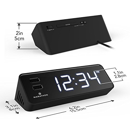 Marathon's LED Alarm Clock & USB Charging Station has many features that make it an excellent addition to your nightstand, work station, kitchen counter or end table. The first thing that separates this clock from the rest are the two, easily accessible USB ports located directly on the front of the clock. These ports are fast charging and are perfect for your phone or tablet. Second, the illuminated digits are bright and easy to read in the dark. If you find them too bright when you are trying to fall asleep there is a dimmer switch to lower the intensity of the illumination, making it appealing to everyone. If it is still too bright, there is a button to turn the display off altogether, without interfering with your charging device. The alarm ON/OFF switch and SNOOZE button are conveniently located on the top so they are easily located in the dark and accessible. Lightweight and compact makes this clock easy to transport. Attractive colours of Snow White, Midnight Black, Cocoa & Graphite Grey are available.Feature