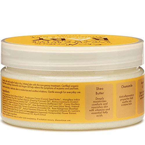 With argan oil and extracts of frankincense and myrrh. Certified organic ingredients. Established 1912. Nourish, soothe and protect dry, cracked or irritated skin quickly wife non-greasy moisturizer for baby's delicate skin. Pure, organic Shea Butter and Argan Oil help relieve the symptoms of eczema and psoriasis. Shea Butter: Deeply moisturizes and heals dry skin with its high content of fatty acids and vitamins. Argan Oil: High in vitamin E, this rare oil softens and renews the skin. Frankincense and Myrrh: Given as a gift throughout history, these precious extracts repair and rejuvenate skin.Feature