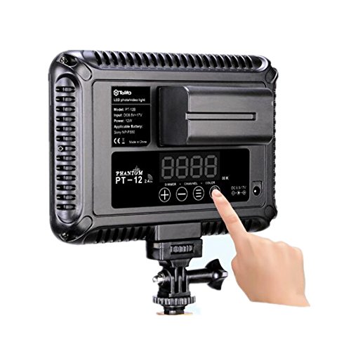 The LED video camera light PT-12B makes it easy to record high quality videos with its unique feature of shadowless light source. With the LED display on the back panel, the color temperature and brightness can be easily controlled as desired. Two ways to supply power:DC power supply and lithium battery. The slim size makes it easy to carry. With the outstanding ventilation system, PT-12B LED camera light will be absolutely impressive for its long time working without any overheated. 1/4" universal screw hole, the hotshoe or tripod can be mounted Specifications: