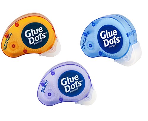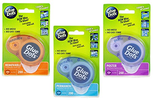 The Glue Dots Variety Pack features one each of the Removable, Poster and Permanent Glue Dots dispensers. Removable Dots bond instantly to clean dry surfaces and can easily be removed. Poster Dots are perfect for hanging photos and wall decoration, unlike putties and tapes, glue dots can be removed or repositioned easily without staining or leaving behind a sticky residue. Permanent Glue Dots feature the strongest glue formula and securely replaces messy liquid glues, requiring no drying time. These Dots are acid and lignin free and non-toxic. They bond easily, the pressure sensitive dots are perfect for the home, office and school. Each dispenser contains 200 adhesives, 3/8 inch diameter.