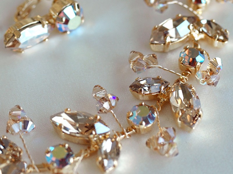 ネックレス:スワロフスキークリスタル/スチール(ゴールドメッキ仕上げ) イヤリング:真鍮にロジウムメッキ |