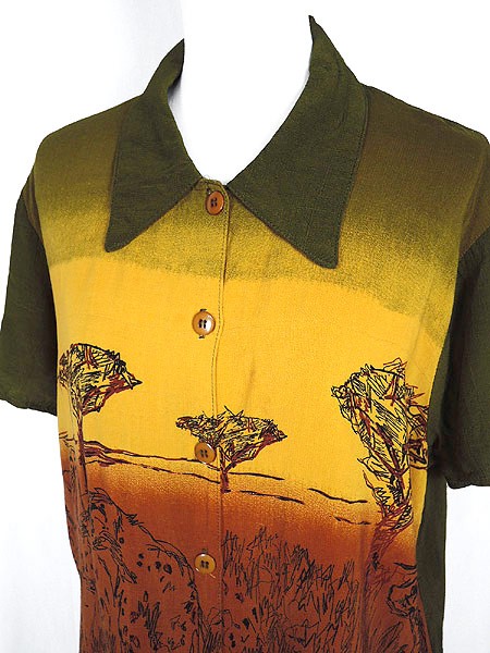 Ladies ブランド- カラーカーキ・オレンジ・黄 メール便不可 コンディション★★★ 素材レーヨン 表記サイズM スタッフコメント右袖下に白いスレダメージ。左胸付近に色ムラシミあり。 実寸サイズ 着丈 60 cm 身幅 49 cm 肩幅 42 cm 袖丈 18 cm ※ウエスト・ヒップ以外は平置き採寸