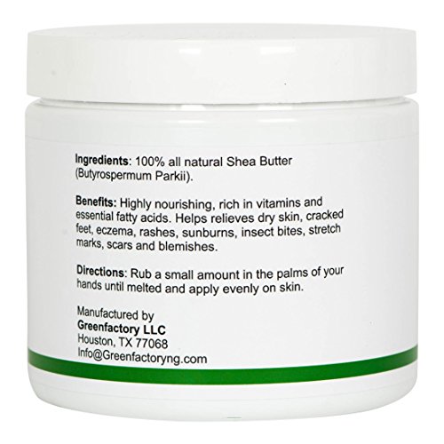 What makes Greenfactory unique? Our products are 100% natural with no added additives, preservatives or chemicals. We produce our products directly from our facilities in West Africa with no middlemen and we source the best quality Shea nuts directly from cooperative farmers dedicated to sustainable and organic farming. Our products are not used on animals and are packaged in the USA. Benefits: Highly nourishing, rich in vitamins, essential fatty acids and anti- oxidants. Relieves dry skin, cracked feet, eczema, rashes, sunburns, insect bites, stretch marks, scars and blemishes. Store in a cool dry place.Feature