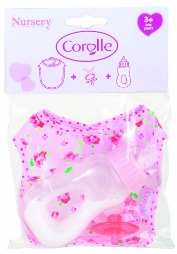 - Feature : The charming print bib, feeding bottle and pacifier all for a Corolle baby doll / Everything to take care of your baby doll from morning till night / Your child will feel like a real mom or dad when they use these accessories to add another element to playtime / At Corolle we bring caring, savoir-faire and style to everything we create, so that every little girl can find the doll of her dreams in our collection / Every Corolle doll is styled in France