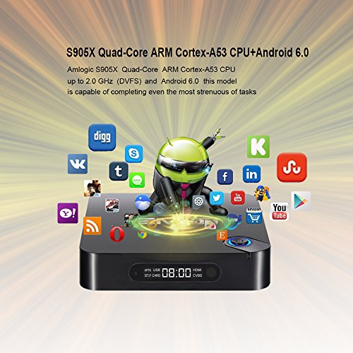 -. Feature : [ 2016 NEWEST Android 6.0 ] - EM95X Box is the newest version with Android 6.0 OS, Wi-Fi and 2K*4K and 3D video support. / [ 2016 NEWEST Chipest ] - Amlogic S905X CPU, 2GB of DDR3 Ram and 16GB of Flash Storage,Cortex A53 2.0GHz Quad Core Processor 64Bit Penta-Core Mali Mali-450 up to 750 Mhz GPU. / [ Fully Loaded unlocked ] - KODI 16.1 Pre-installed,Enjoy movies from Netflix, Phoenix, Genesis, Navix,you also can play thousands of android games in a large screen smoothly. / [ Advanced Design ] - It has three USB ports, Ethernet port, HDMI port, SD slot, AV port,Spdif port and the power port / Cut your monthly TV subscription and enjoy FREE Movies, shows and live entertainment from all over the world including sports. No restrictions! Forget the limitations and necessary payments by using Apple TV or ROKU! You also can play thousands of android games in a large screen smoothly. Install your favorite apps and enjoy advanced technology. SAVE your money for paying cable, satellite or whatsoever.